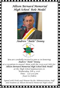 Join us Wednesday, February 4, 2026 from 1:30–3 PM in the ABMHS gymnasium as we honour, Antle Denny, for their dedication to community, culture, and inspiring our youth.